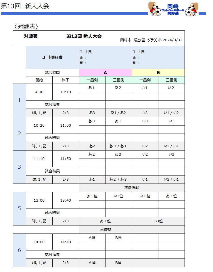 第13回新人大会及び第18回クラブチーム大会Okazaki.Foot2024年2月5日遅くなりましたが、第13回新人大会の開催要綱が出来上がりましたので展開いたします。合わせて、第18回クラブチーム大会の開催要綱もお知らせいたします。2023年度新人大会 実施要項.pdfダウンロード:PDF • 591KB2023年度クラブチーム大会 実施要項.pdfダウンロード:PDF • 601KB